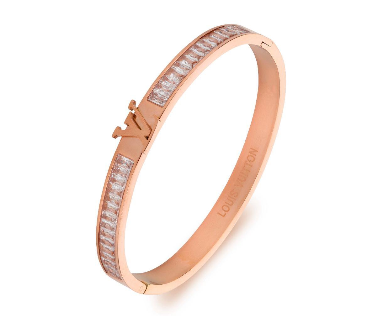 This elegant bangle bracelet features a rose gold-toned finish, likely made of stainless steel. The top of the bracelet is adorned with a row of clear, rectangular-cut crystals (strass). The iconic Louis Vuitton “V” signature is prominently displayed near the opening, also in a rose gold tone. The brand name “LOUIS VUITTON” is subtly engraved on the side of the bangle. It has a hinged opening and a secure clasp closure. This bracelet combines the luxury brand’s signature design with sparkling details, making it a sophisticated accessory.